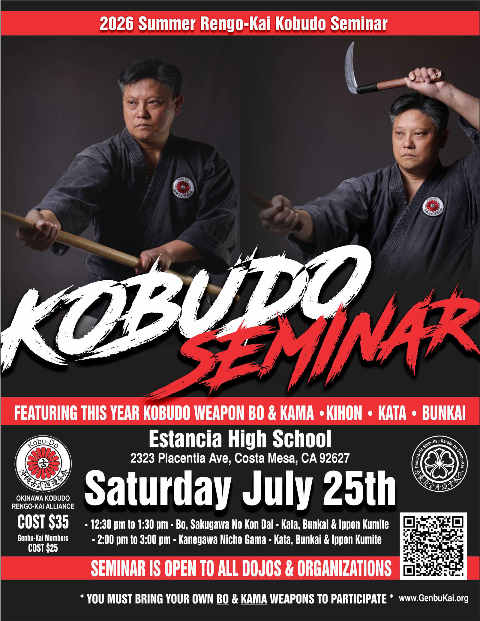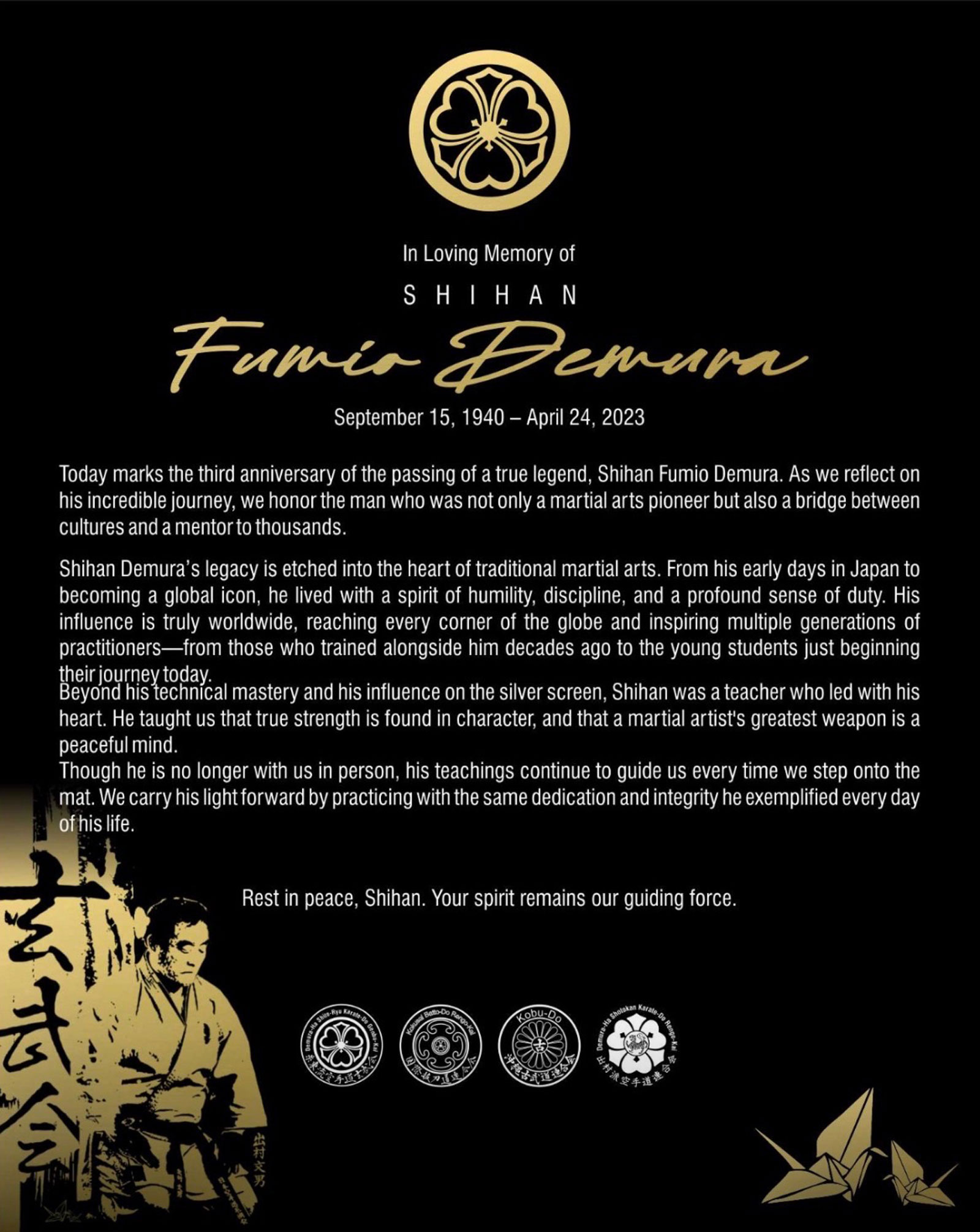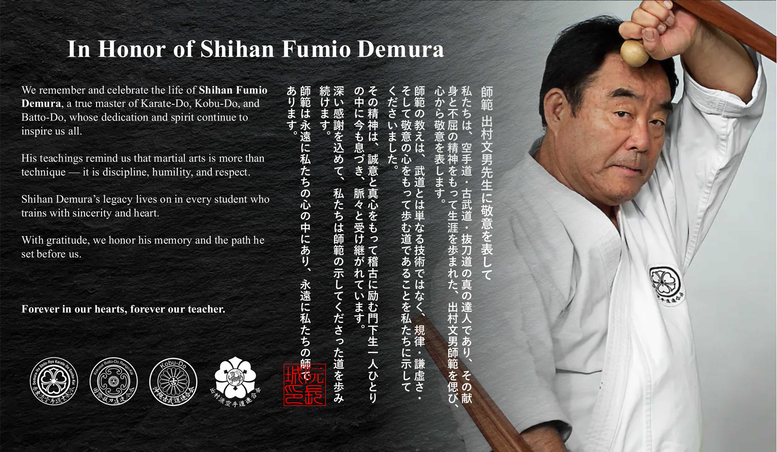In the mid 1960s, Fumio Demura brought his style of martial arts to America, incorporating not only the physical arts but also the virtues of bushido. Currently there are over 50 locations worldwide offering classes in karate-do, kobu-do and batto-do as part of Demura-Ha Shito-Ryu Karate-Do Genbu-Kai. When Shihan Fumio Demura passed away in 2023, Sensei Thanh Nguyen and Sensei David Hines were entrusted to continue his legacy.