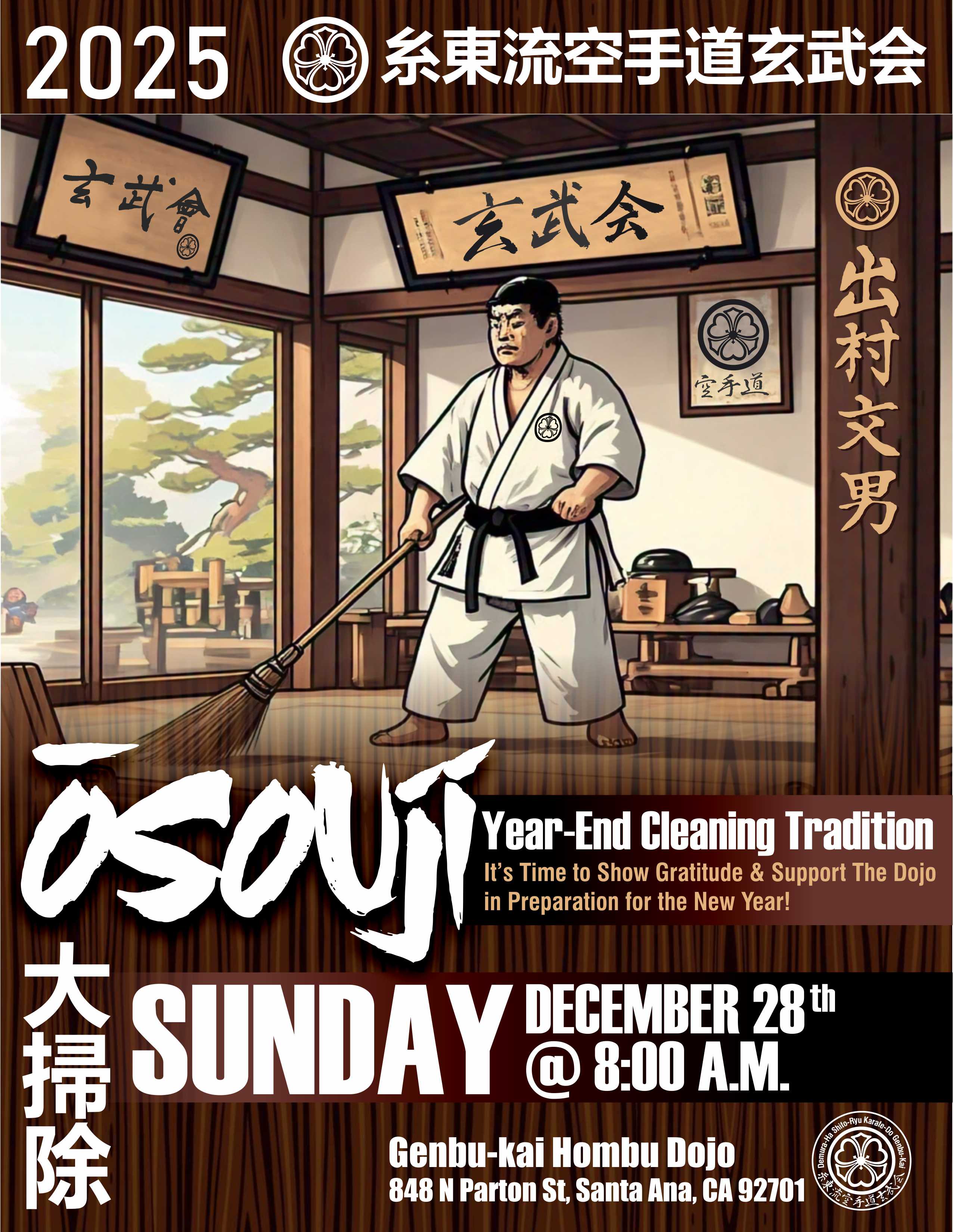 Event: Osouji - Dojo Cleaning Date: Sunday December 28th, 2025 Location: Hombu Dojo Address: 848 N Parton St, Santa Ana, CA 92701 Time: 8:00 AM to Noon Download Flyer